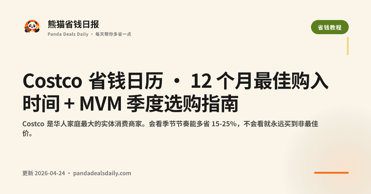 大部分华人家庭只知道"Costco 便宜",不知道<strong>同款商品在它最佳窗口比淡季省 15-25%</strong>。本篇给完整月度日历 + 每季度 MVM(Member Value Month,会员专享优惠月)的选购策略。
